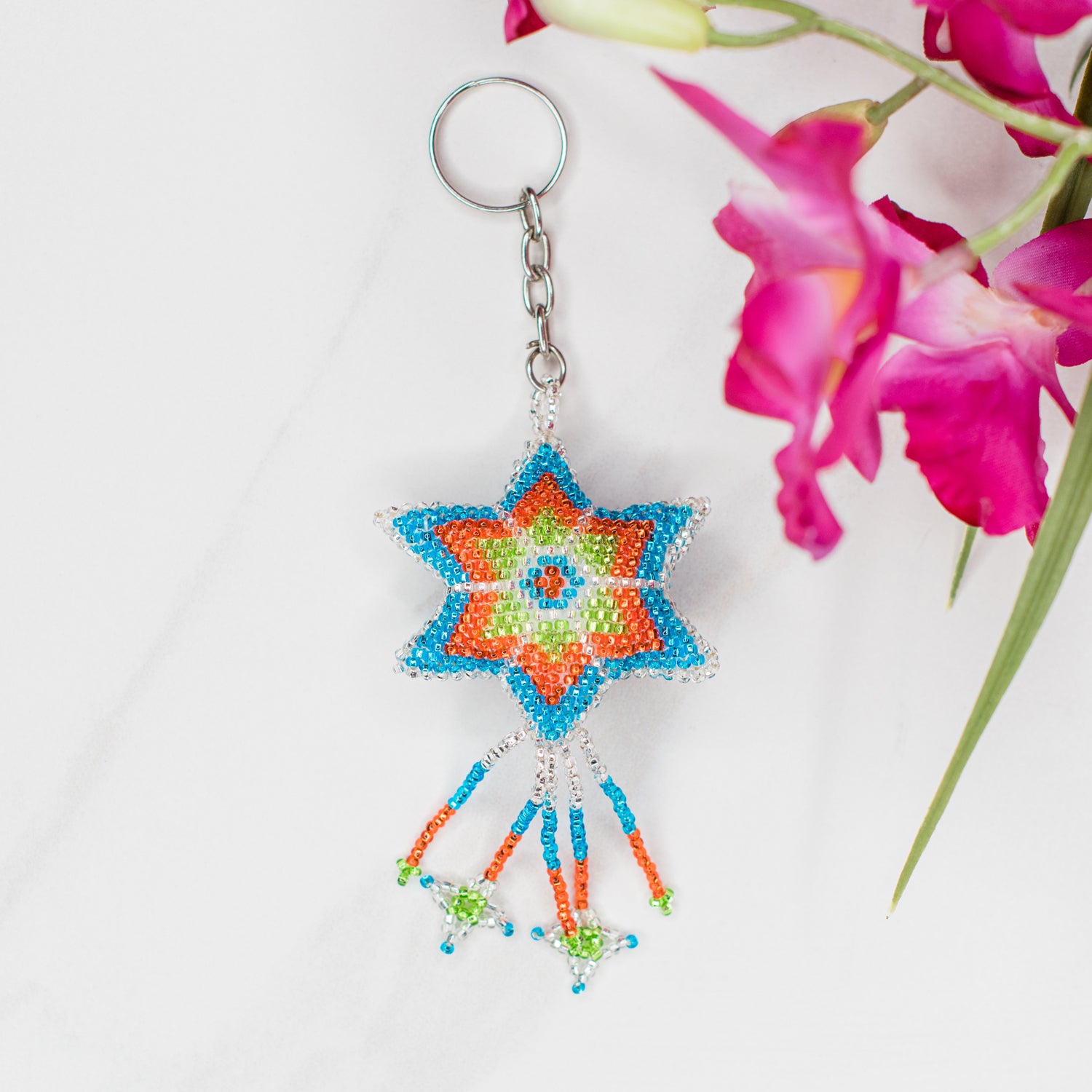 Keychain measures 6in from the top of the keychain to the bottom of the star tassels. Star is 2in wide.