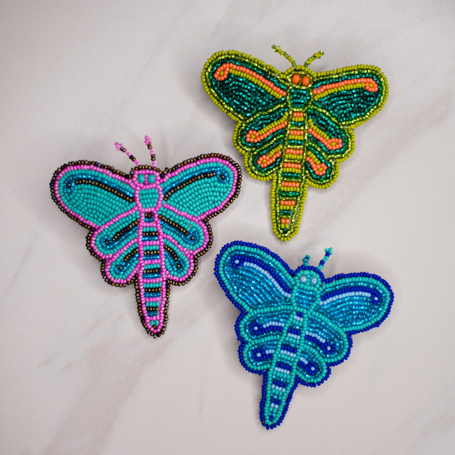 Whimsy and charming, these adorable Dragonfly Barrettes make the perfect accessory for that daring little girl (and for Mommy alike)! Each barrette is hand beaded in a colorful assortment of colors.