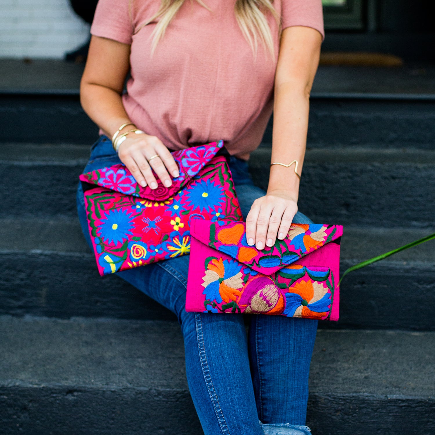 Handmade by women artisans in Guatemala, our Small Fiesta clutch will be a great accessory for the beach or a night on the town. It measures 9 L x 6 H and has a metal zipper closure, metal clasp flap, and shoulder strap. Comes in assorted colors. Each purchase empowers Guatemalan women artisans.