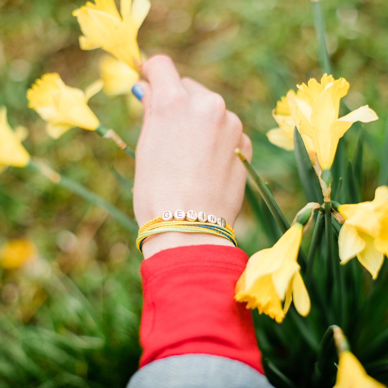 Celebrate the zodiac sign of communication with our Gemini Bracelet. Handmade by Guatemalan artisans, this bracelet set features energetic, youthful colors as are often associated with this friendly, talkative sign. One bracelet spells out Gemini, the second is in the style of our popular 'wind' bracelet representing the air element. As with all of our string bracelets, our astrology sign bracelets are perfect for summer days at the beach, a festival, or the pool.