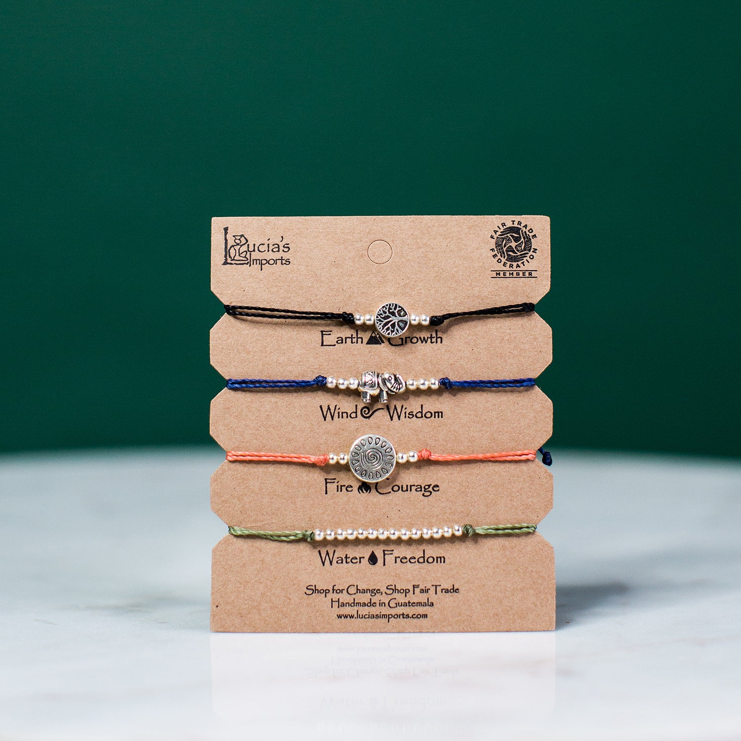 Our carded set comes with a Tree of Life, Elephant, Sun, and Silver Beads charm bracelets each one representing one of the inspiration of Growth, Wisdom, Courage and Freedom. Choose your set in a variety of colorful shades. Each bracelet features an adjustable slip knot closure and small charm for easy wear. Mix and match the bracelets for a fun stack or wear them separately.Each purchase empowers Guatemalan artisans.