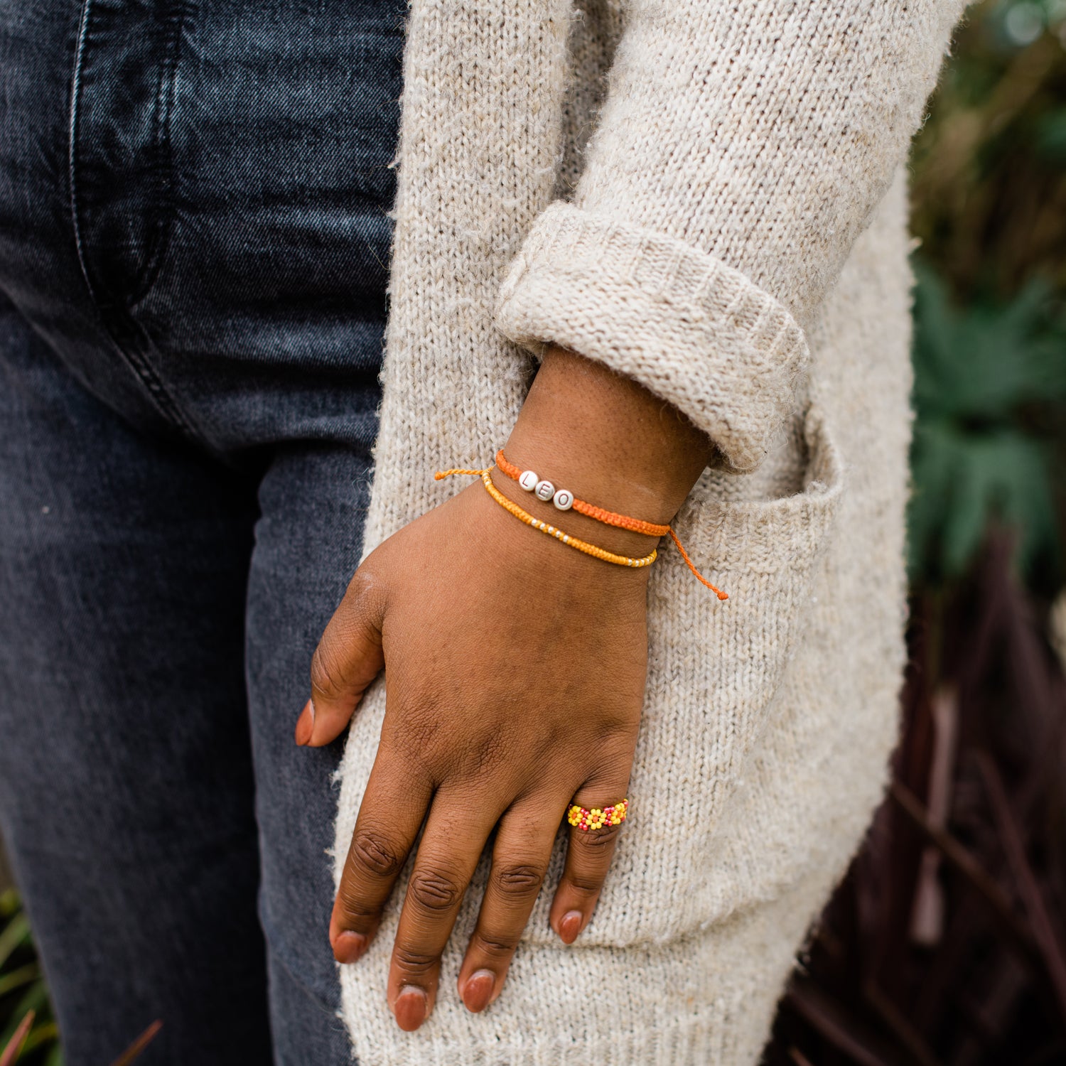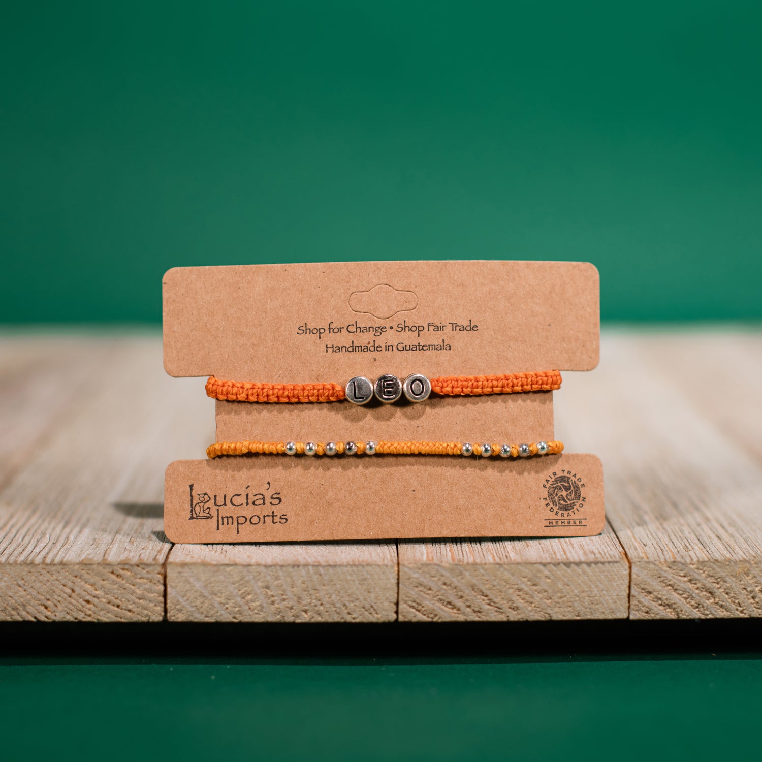 Celebrate the bold leaders of the Leo zodiac sign with this firey bracelet set. Handmade by Guatemalan artisans, this bracelet set features bright oranges that highlight the energy and determination of the lion sign. One bracelet spells out Leo, the second is in the style of our popular 'fire element' bracelet. As with all of our string bracelets, our astrology sign bracelets are perfect for summer days at the beach, a festival, or the pool.