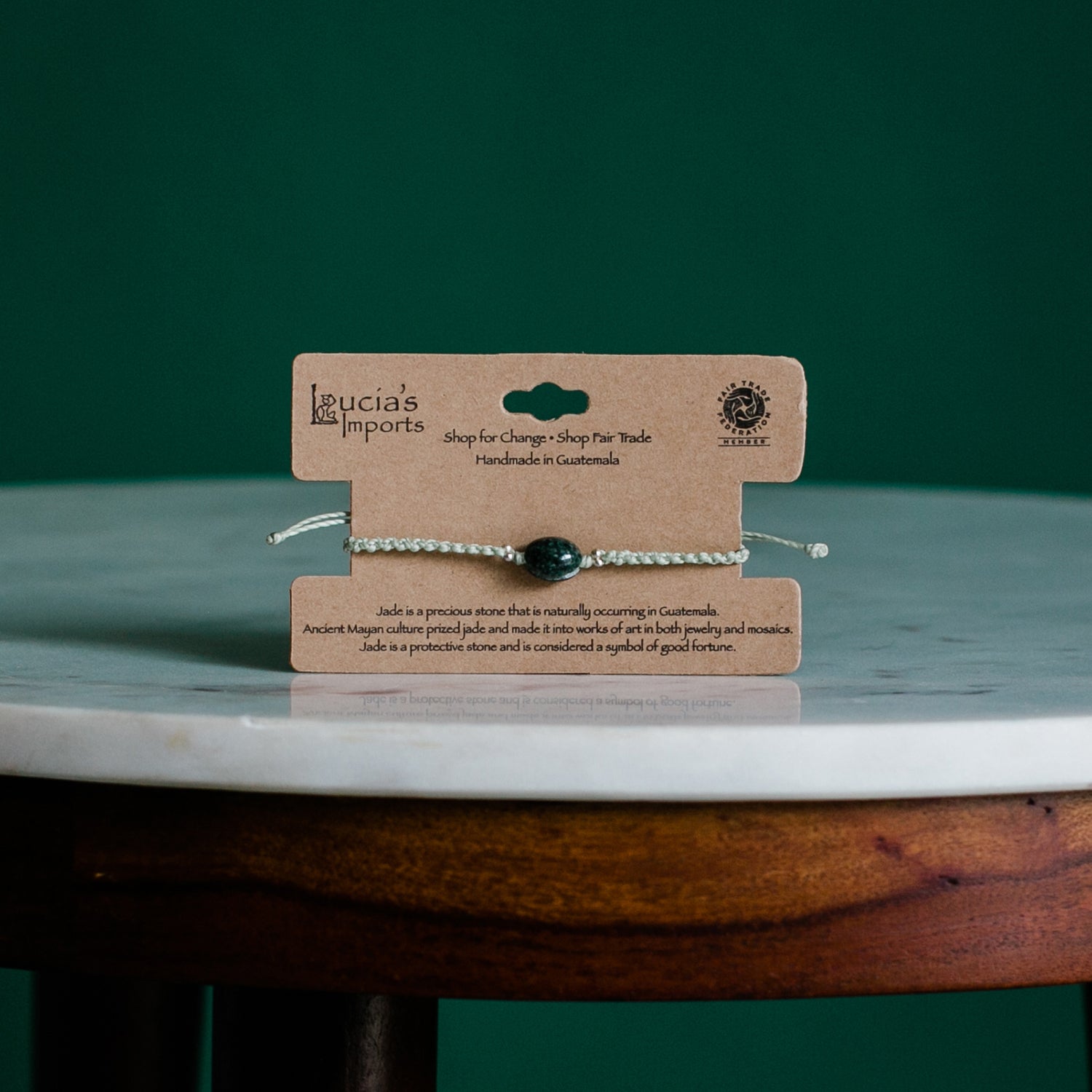 This fair trade Macrame Jade Stackable Bracelet can be worn alone, stacked for a bold look or paired with our string bracelet collection. The bracelet features a jade stone at the center of a woven macrame string bracelet. Bracelet string comes in assorted colors and Guatemalan jade stone color ranges from black to green to purple. Each stone is approximately 9.525 mm in length. Each purchase empowers Guatemalan artisans.