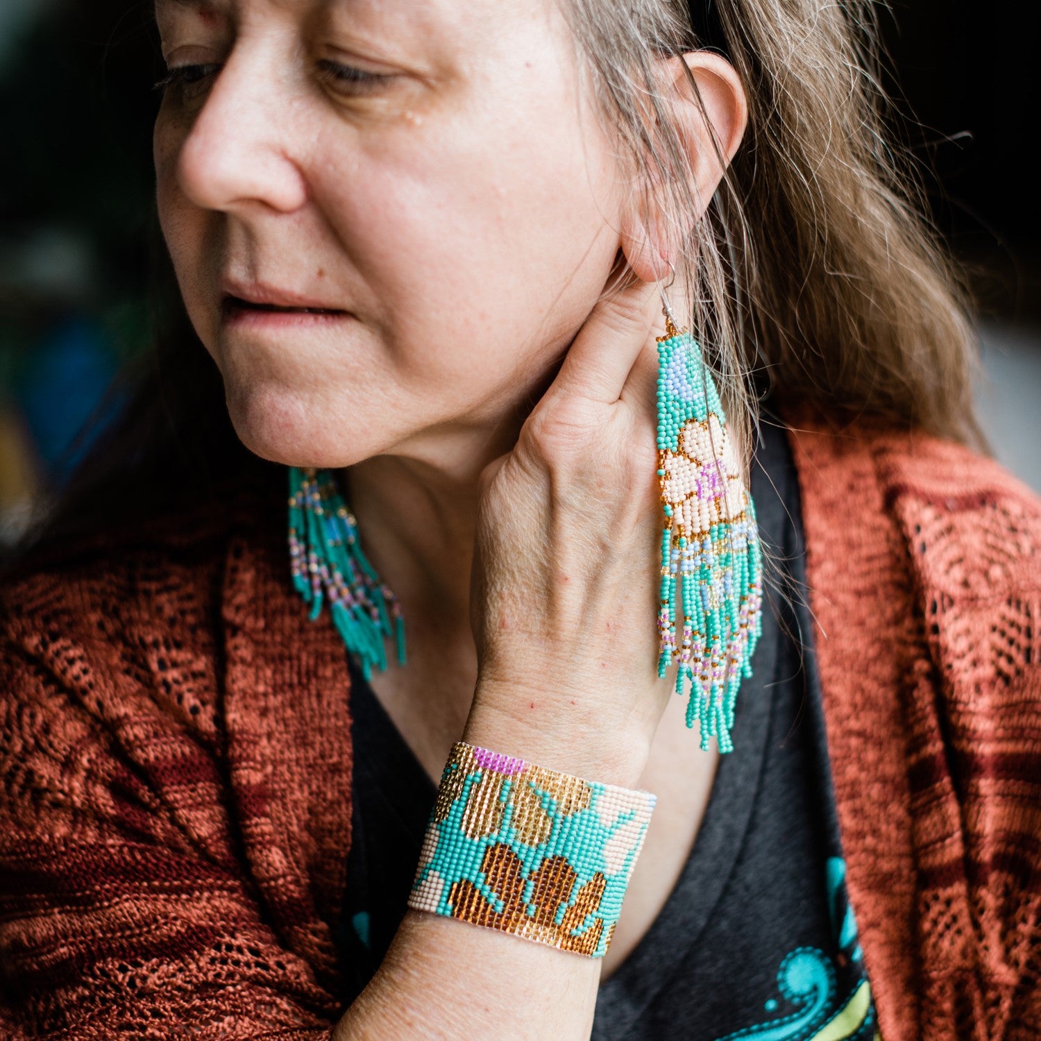 The Moonflower Earring makes the perfect statement piece from day to night. Handmade with glass beads featuring a moon and flower in Turquoise. Comes in 2 other colors:Â Orange, and Black .Earring measures 6 long from nickel-free hook to bottom fringe and 1.5 W. Each purchase empowers artisans in Guatemala!