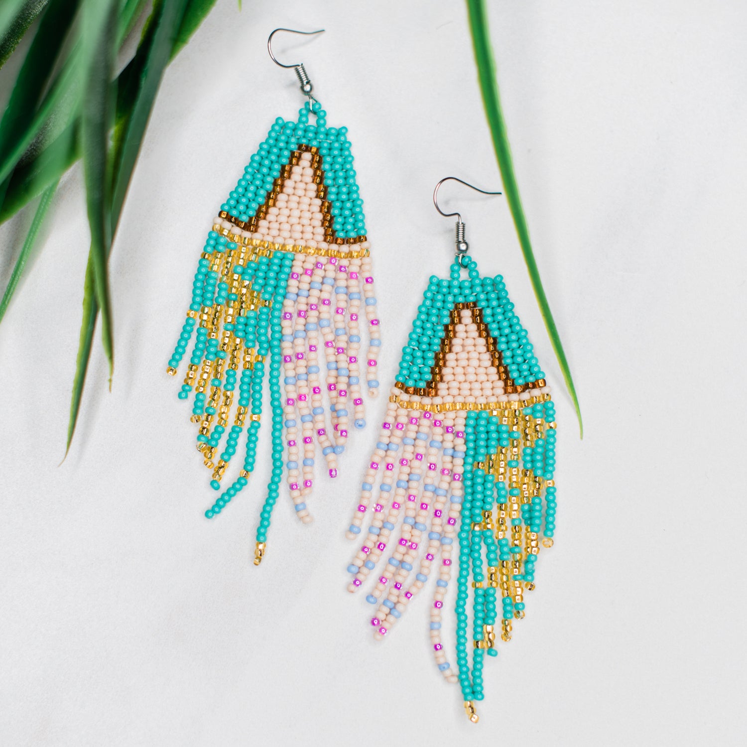 The Rayas Earring is handbeaded in a woven geometric design for an eclectic look that will mark your outfit! Earrings measure 4 1/4 Long from nickel-free earwire to bottom fringe.Comes in turquoise cream. Shop the collection in Orange and Black. Each purchase empowers Artisans in Guatemala!
