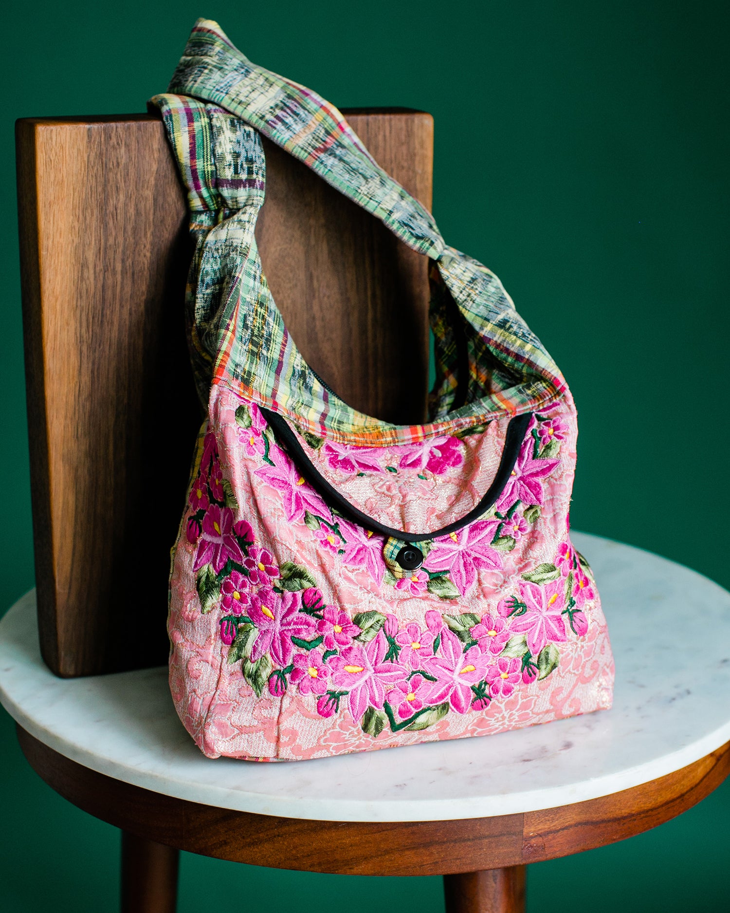 Eco- friendly and fashionable recycled Guatemalan purse. Produced under fair trade principles. Each purse is uniquely designed from recycled hand embroidered and handwoven fabrics from the Mayan women's traditional dress. Fully lined with inside pocket. Front pocket. 15.5 L x 12h x 5.5 w. Strap is 36.
