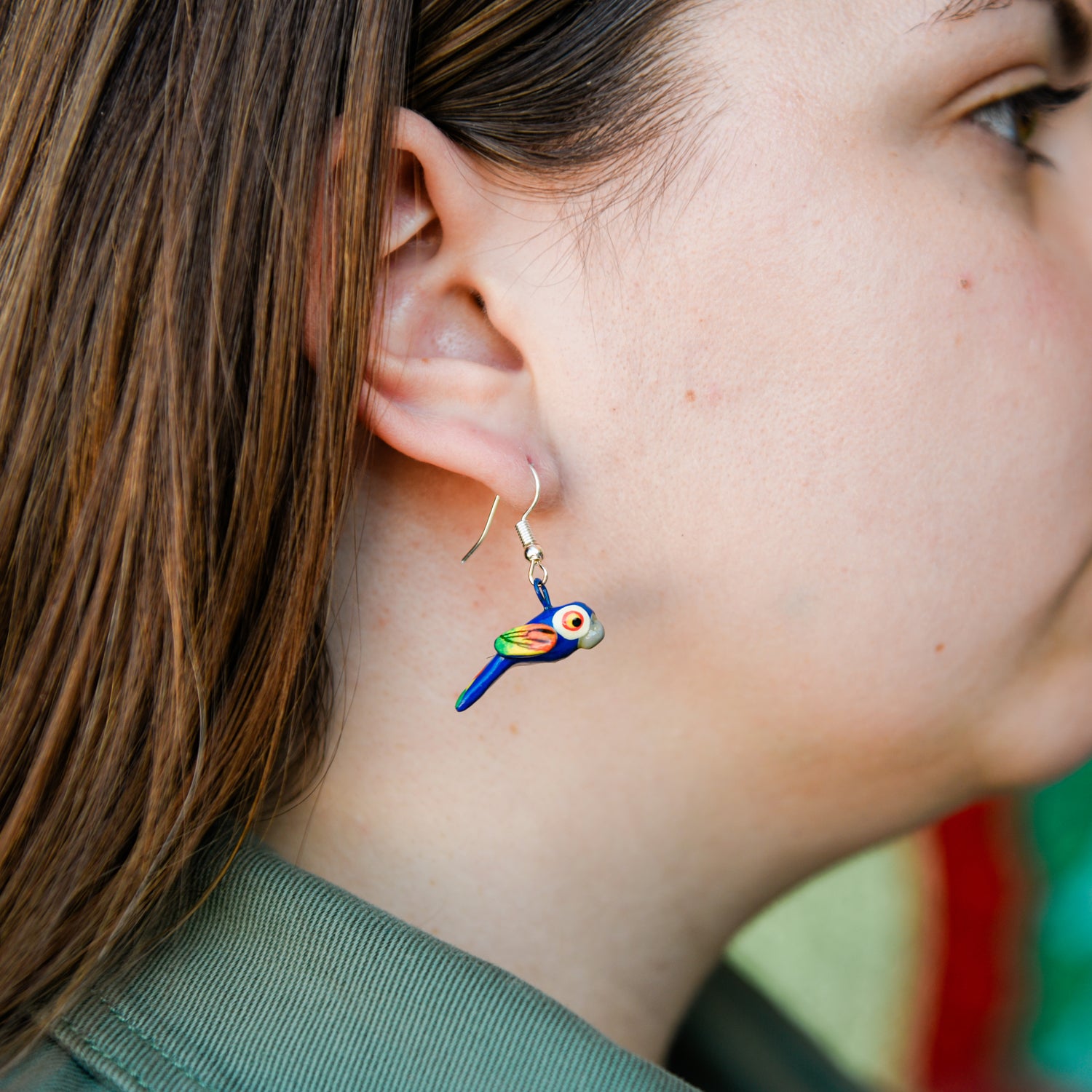 These charming ceramic parrot earrings feature vibrant colors and intricate detailing, capturing the playful spirit of these tropical birds. With their bold hues of green, yellow, and red, the parrots appear to be perched in mid-flight, adding a fun, exotic flair to any outfit. The lightweight design ensures comfort, while the hand-painted finish showcases the artisanal craftsmanship, making these earrings a lively and colorful accessory for those who love nature and unique jewelry.