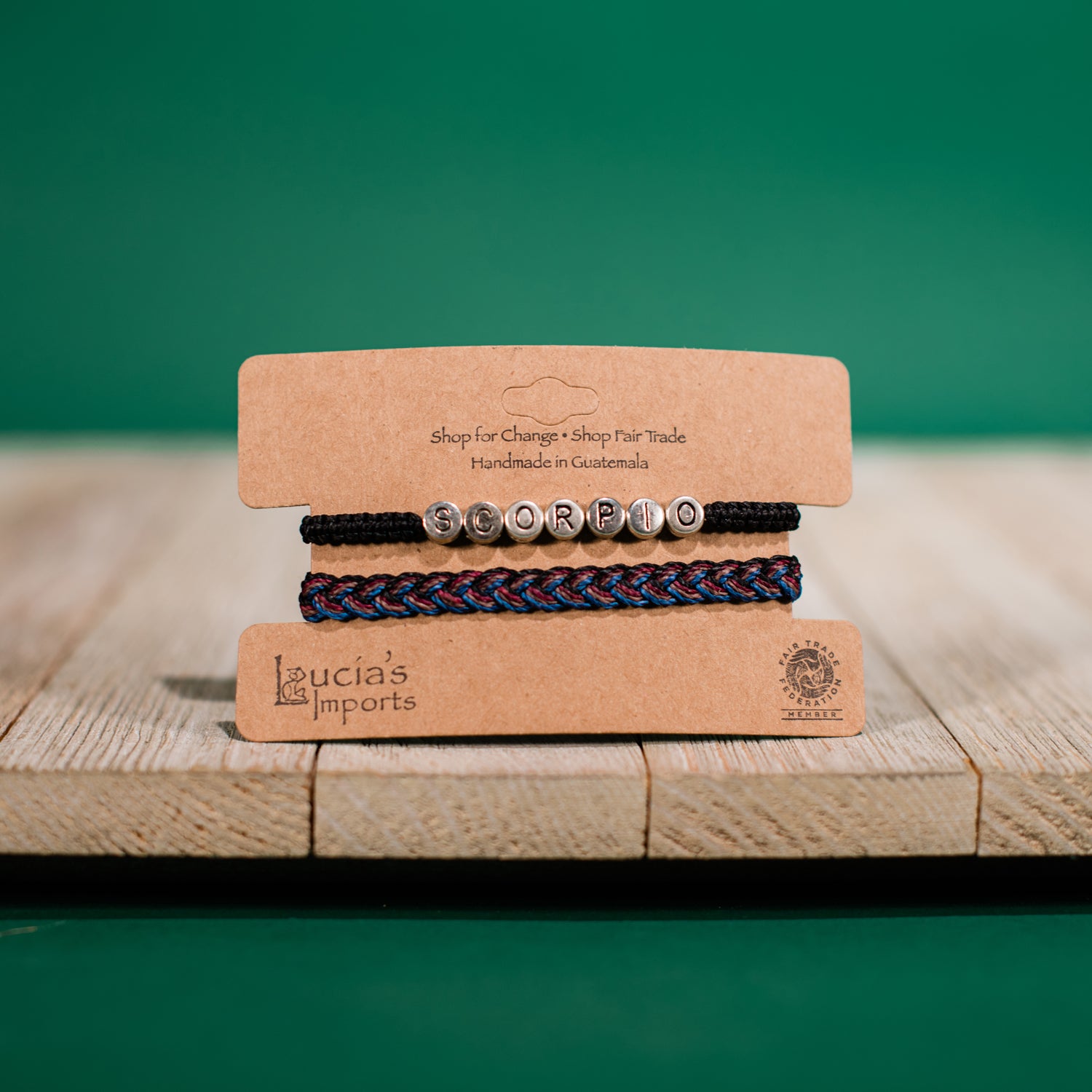 Celebrate the passionate and determined 8th zodiac sign with our Scorpio Bracelet. Handmade by Guatemalan artisans, this bracelet set features purples and blues alongside black to emphasize the bravery and emotional depth often associated with this honest sign. One bracelet spells out Scorpio, the second is in the style of our popular 'water element' bracelet. As with all of our string bracelets, our astrology sign bracelets are perfect for summer days at the beach, a festival, or the pool.