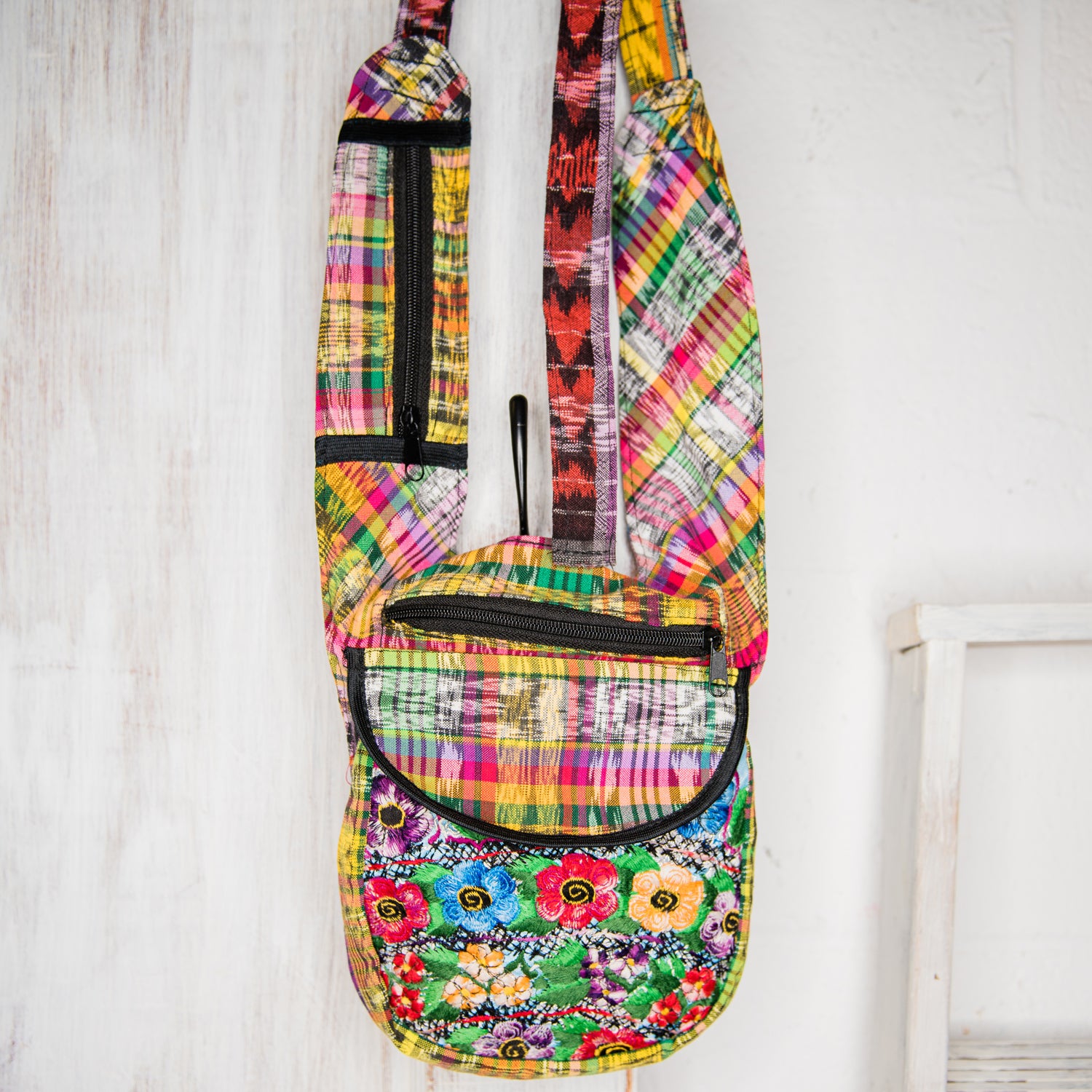 Colorful and festive recycled hipster pack~ Can be worn as a crossbody Bag as well !Comes in assorted colors and patterns~ Adjustable belt fits waists up to 48Front and strap zippers and snap closure on flap.~8 wide by 10 high.