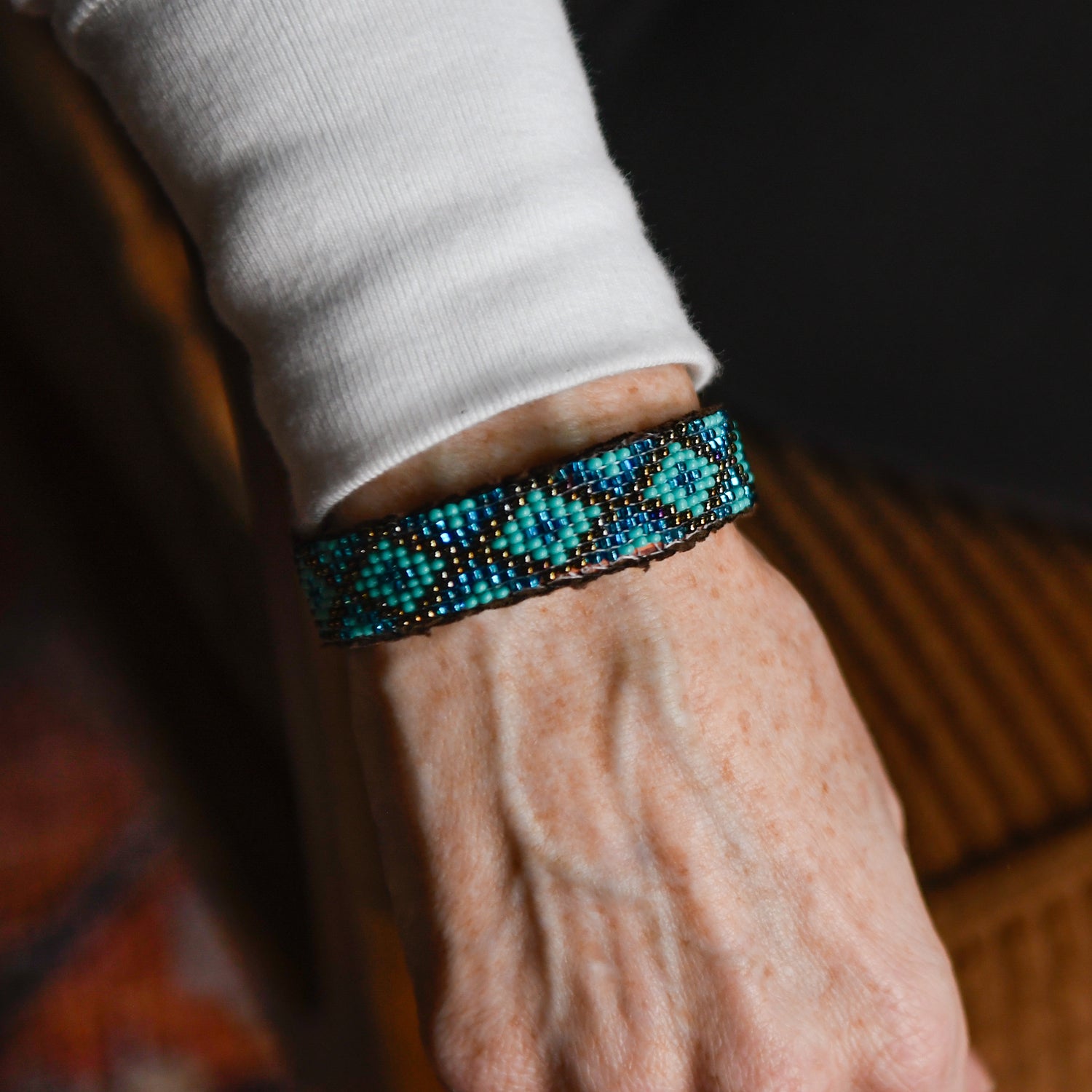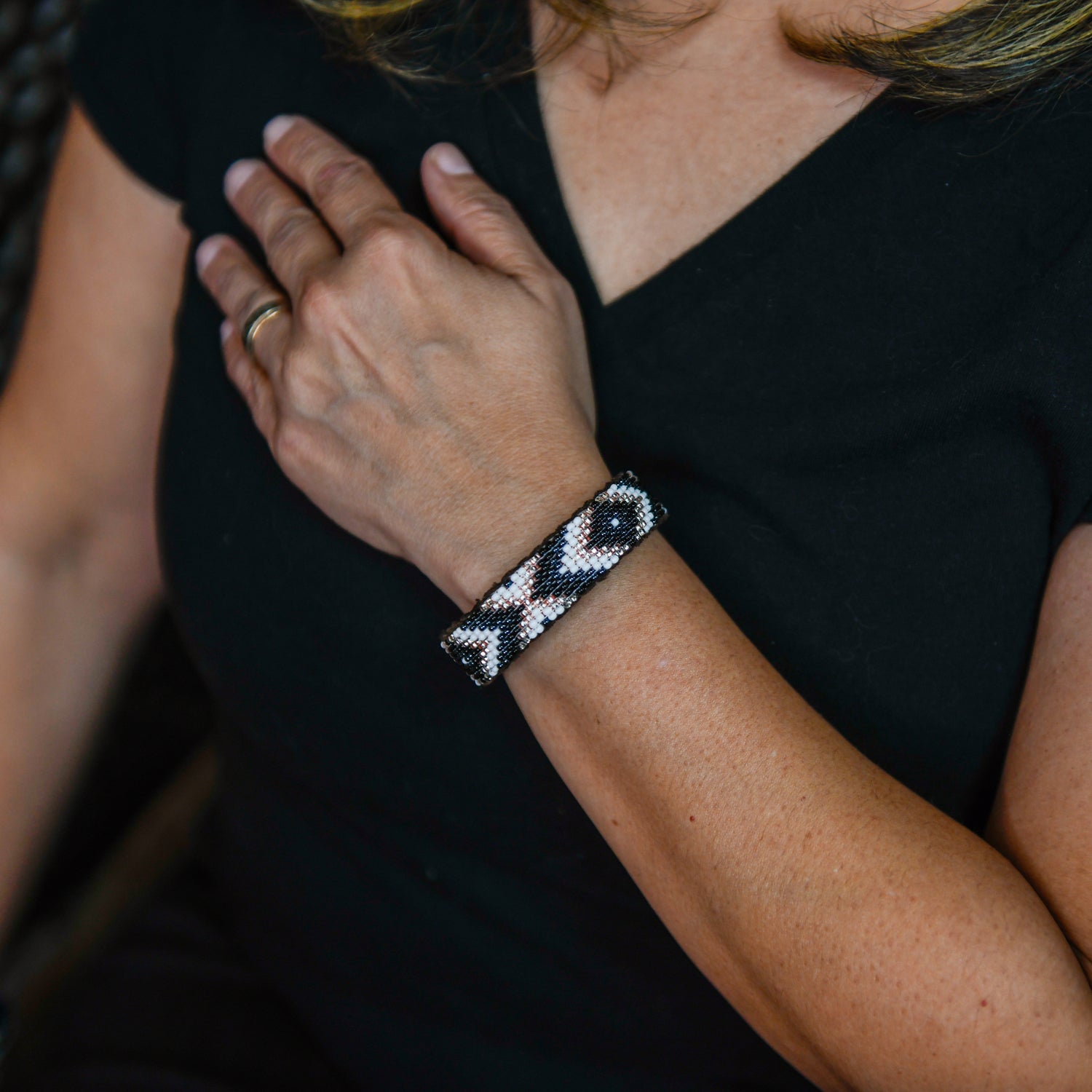 This handcrafted Western cuff features 9 rows of vibrant beads in intricate Mayan patterns, set against a soft vegan leather suede interior for comfort and durability. A striking, ethical accessory that blends bold style with cultural craftsmanship, perfect for adding a unique touch to any outfit.