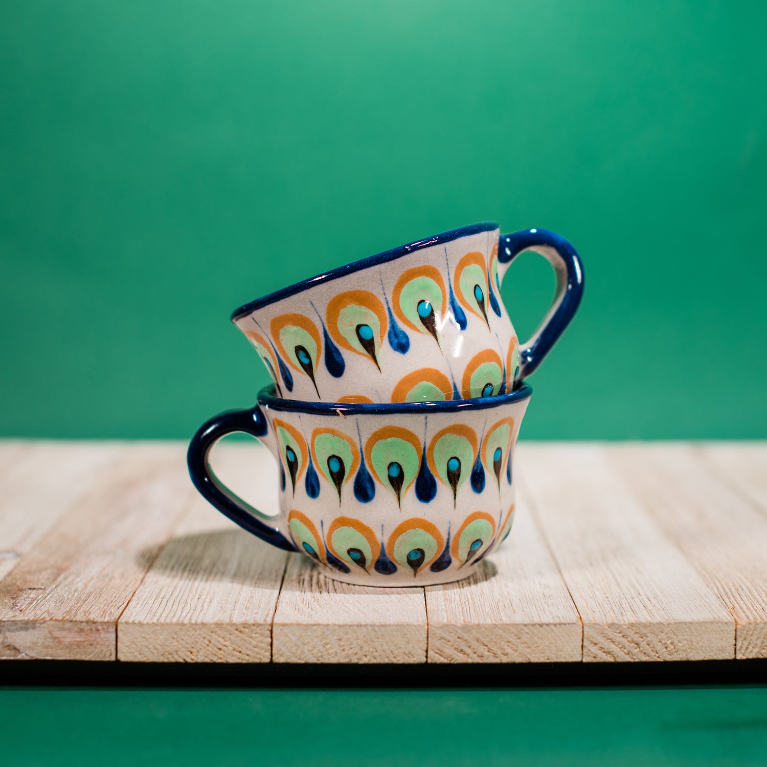 Ceramic tea cup in white 8 ounces ~Pair it with the brown~ Not sold as a set. NOTE: if you would like to make a set... Please specify in comment box so that we can try to match colors and patterns as closely as possible. Microwave and dishwasher safe with lead free paint.